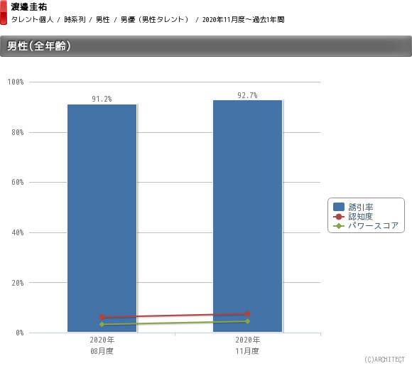 タレントパワーランキングの調査では、2020年8月度に8.2%だった認知度が、11月度に8.5%に。認知度に誘引率を掛け合わせたタレントパワーは8月度3.6%から11月度4.2%とさらに高い上昇率を示している。男女別で見ると男性の誘引率の方が高いのが特徴的で、女性は71.7%、男性は92,7%となっている(2020年11月度)。