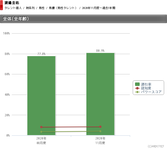渡邊圭祐 時系列 / 男優(男性タレント) / 2020年11月度~過去1年間/対象者(上:全体 下:男性)