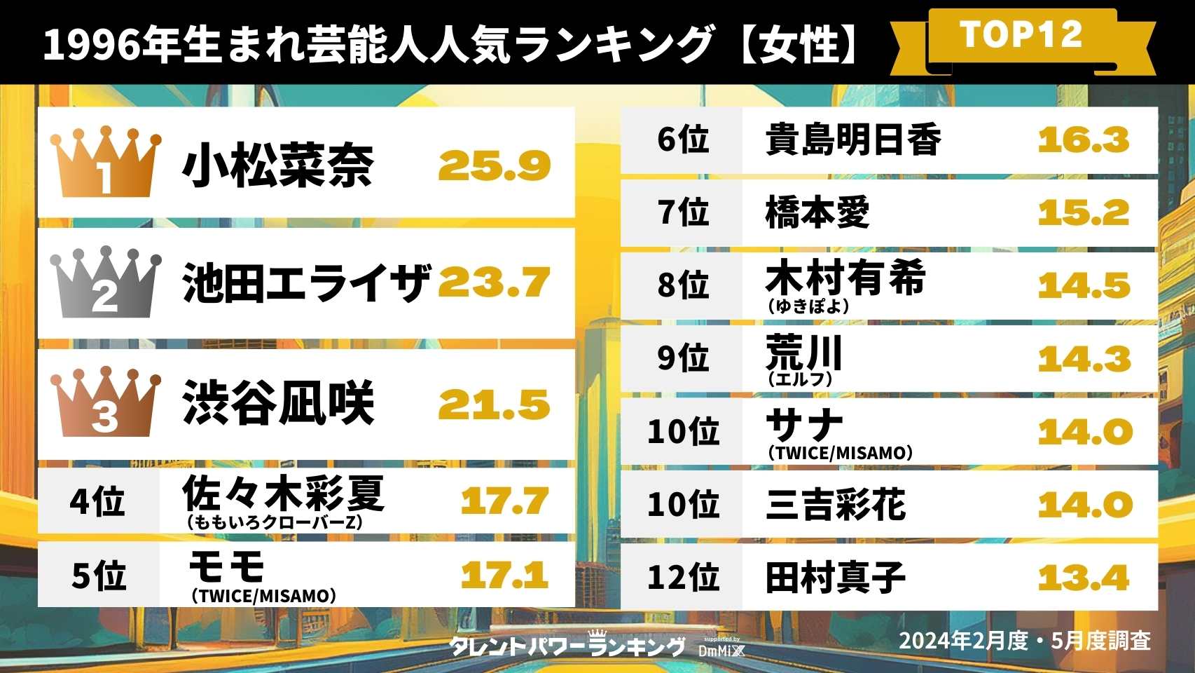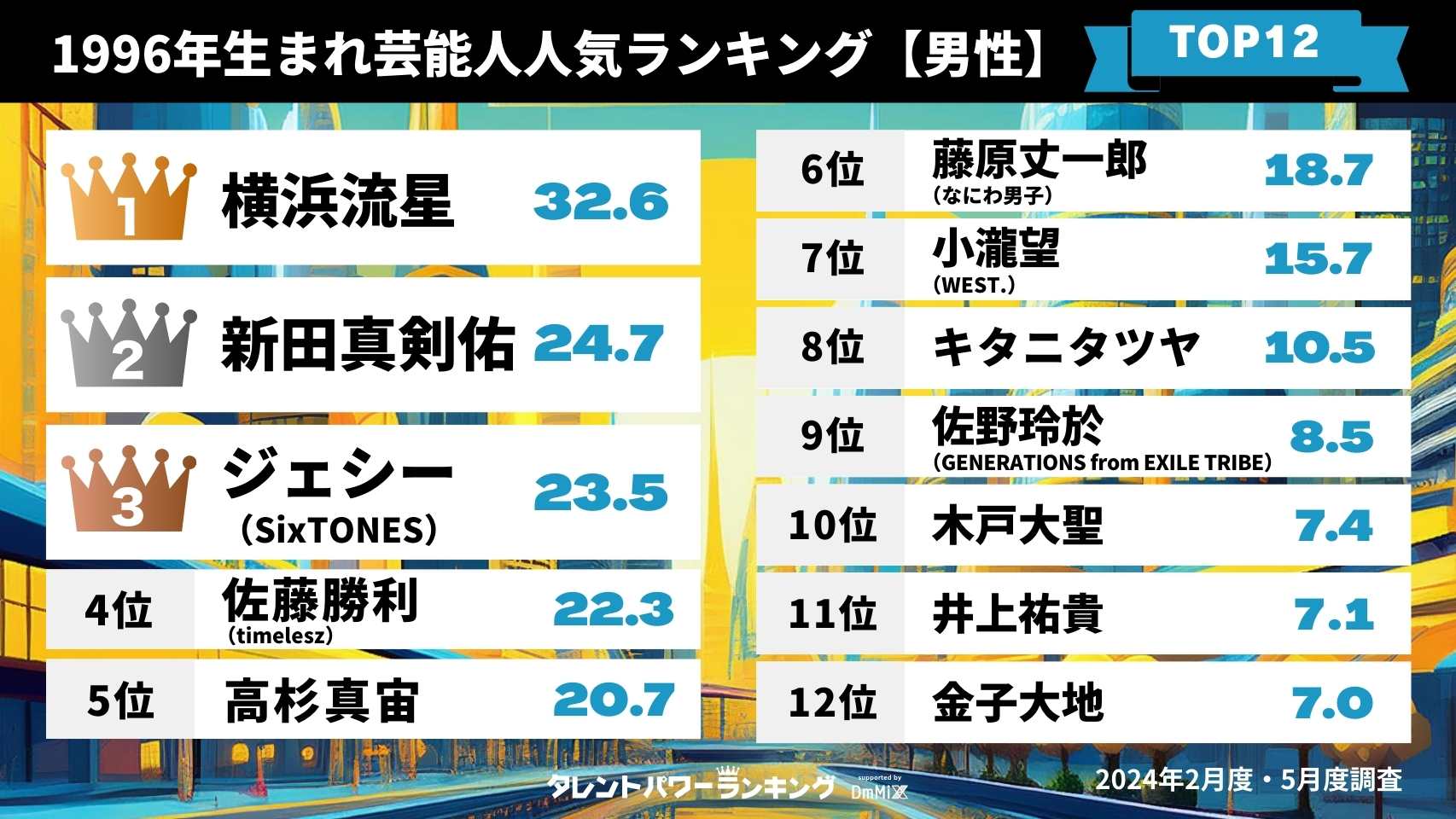 1996年生まれの芸能人人気ランキングは、株式会社アーキテクトが実施する業界最大規模のタレント調査『タレントパワーランキング』をもとにパワースコアを算出しました。こちらのデータから、ランキングが作成されています。