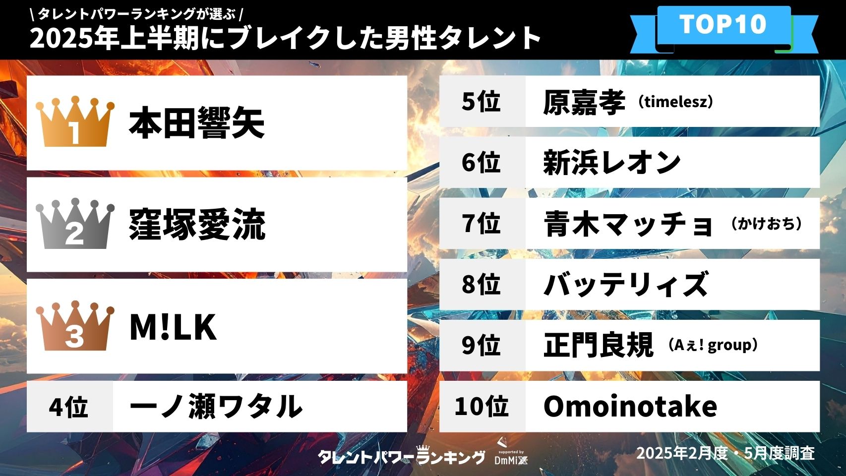 タレントパワーランキングが選ぶ2025年上半期にブレイクした男性タレント・女性タレントTOP10