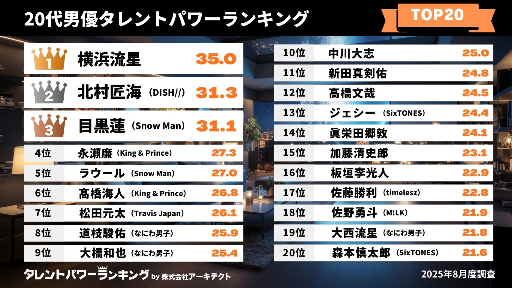 株式会社アーキテクトが実施しているタレントパワーランキングの定期調査で、調査対象として登録されている20~29歳の男優の中でタレントパワー(パワースコア)が高かった順に、それぞれランキング化しました。タレントの年齢は2025年12月25日時点です。