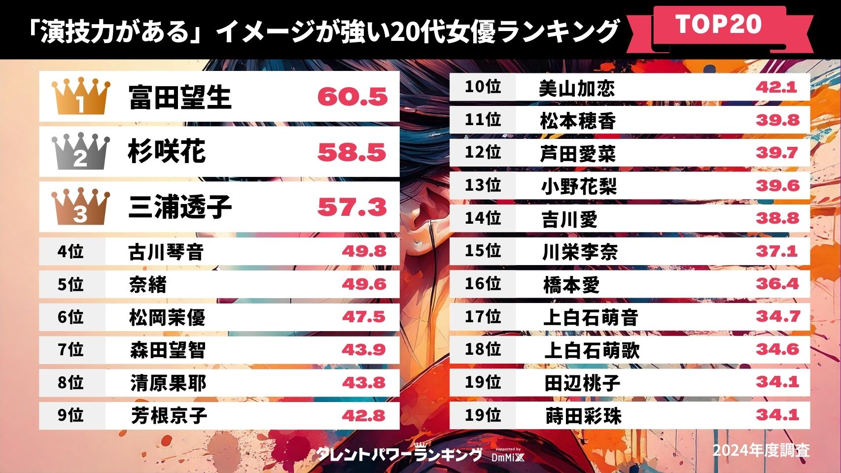 アーキテクトが実施しているタレントパワーランキングのイメージワード調査は、そのタレントの名前も顔を知っていると答えた回答者に用意したワードの中から3つ選んでもらっています。ここでは、20代の女性俳優・タレントの中で、2024年度の最新データ結果で「演技力がある」のスコアが高かった順にランキング化しました。年齢は2024年12月1日現在です。