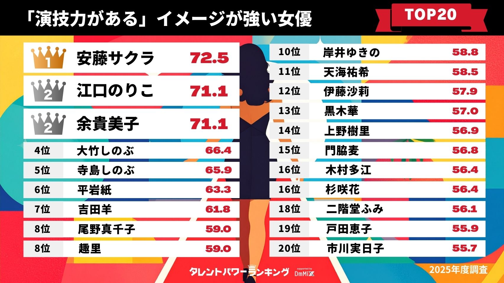 アーキテクトが実施しているタレントパワーランキングのイメージワード調査は、そのタレントの名前も顔を知っていると答えた回答者に用意した17のワードの中から3つ選んでもらっています。この調査において、調査対象となっている女優の中で、「演技力がある」を選んだ人の割合が高かった順にランキング化しました。今回は2025年度の最新データを使用しています。
