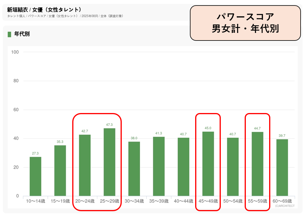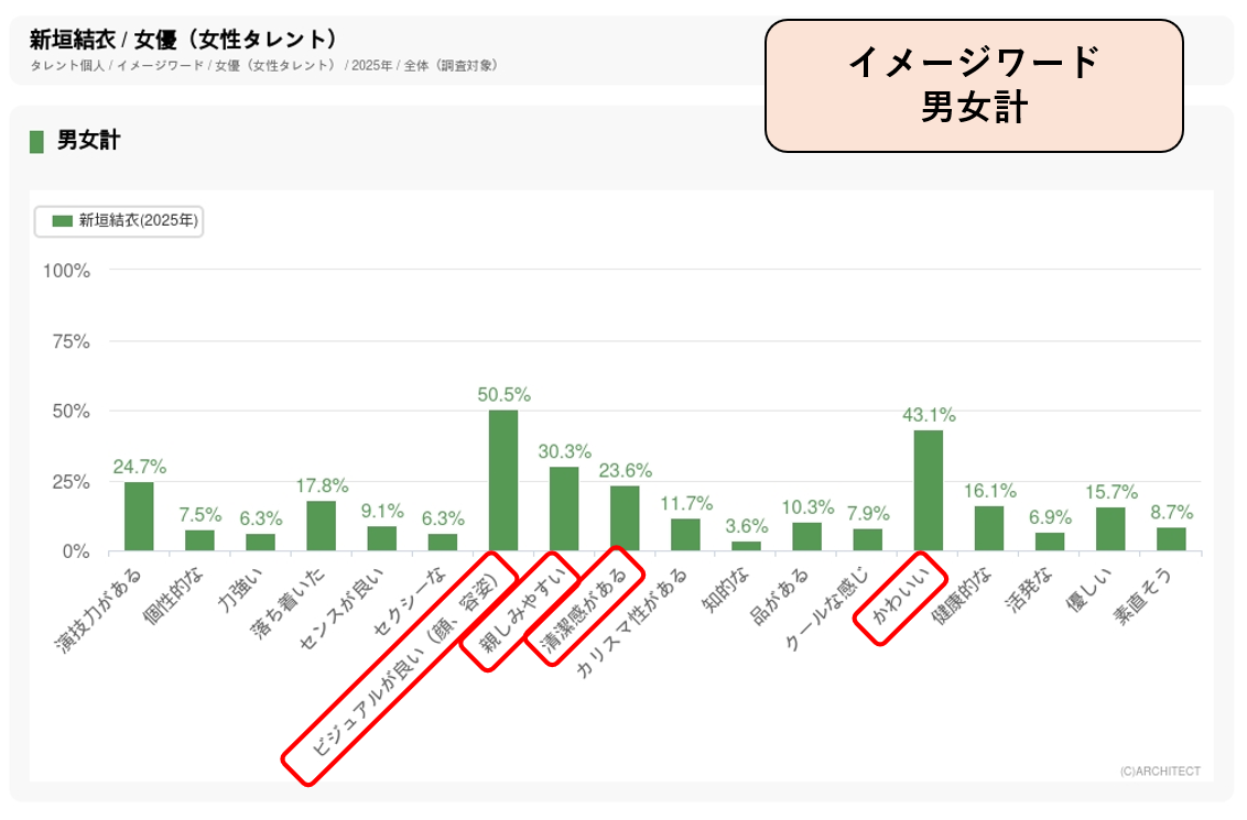 「十六茶」のCMには2009年から出演しています。2025年夏に放送された“16チャージ!野球場”篇は夏の水分補給としてのお茶のニーズを意識して、野球観戦しながら新垣がゴクゴクとペットボトルの十六茶を飲む姿が描かれました。年代別のパワースコアは20代前半・後半に加えて40代後半、50代後半などでも高く、幅広い年代での高い支持が起用につながっています。イメージワード調査では「ビジュアルが良い」「かわいい」に加えて「親しみやすい」「清潔感がある」などのスコアも高く、そういったイメージがお茶CM起用の要因となったのではないでしょうか。