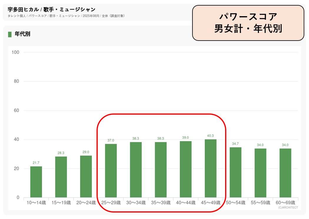 パワースコアは、20代後半から40代後半まで幅広い年代で高くなっています。特にスコアが高いのは、30代後半から40代後半にかけての女性ですが、20代後半・30代前半も高いスコアを示しています。2024年からアンバサダーに就任してCMに出演するとともにCMソングも担当している「綾鷹」は、同年のフルリニューアルによって商品のターゲットをそれまでの40~50代から20~30代に変更しました。サブスクサービスの普及で若い層においても宇多田ヒカルの楽曲が支持されていることが、CM起用の要因になったのではないでしょうか。