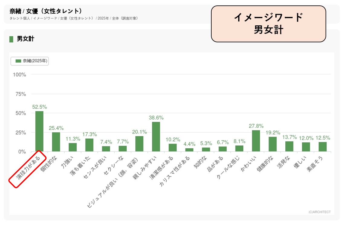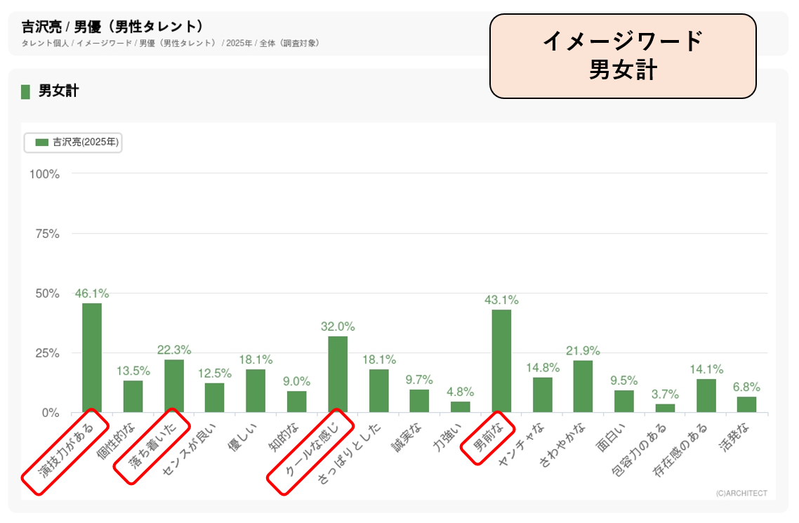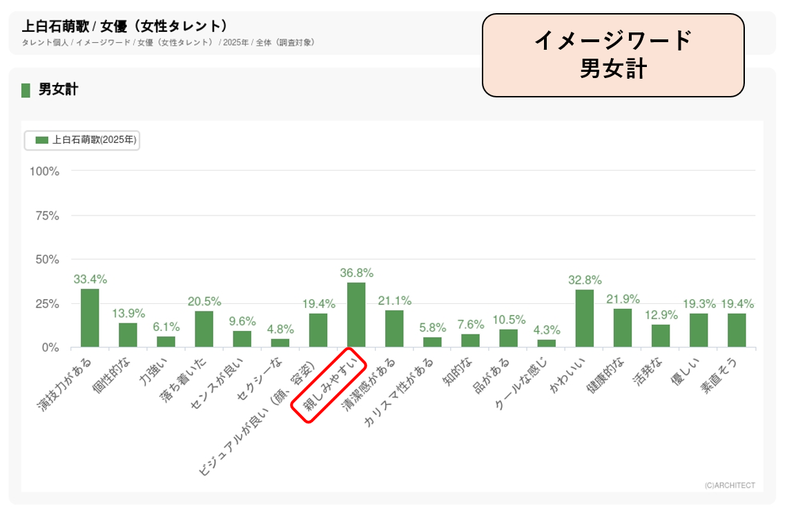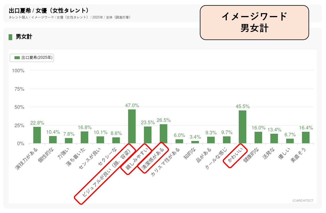 また、イメージデータ調査では、タレントのジャンルごとに決められているイメージワードのうち、そのタレントがどのようなイメージを持たれているかを年に1回調査しています。