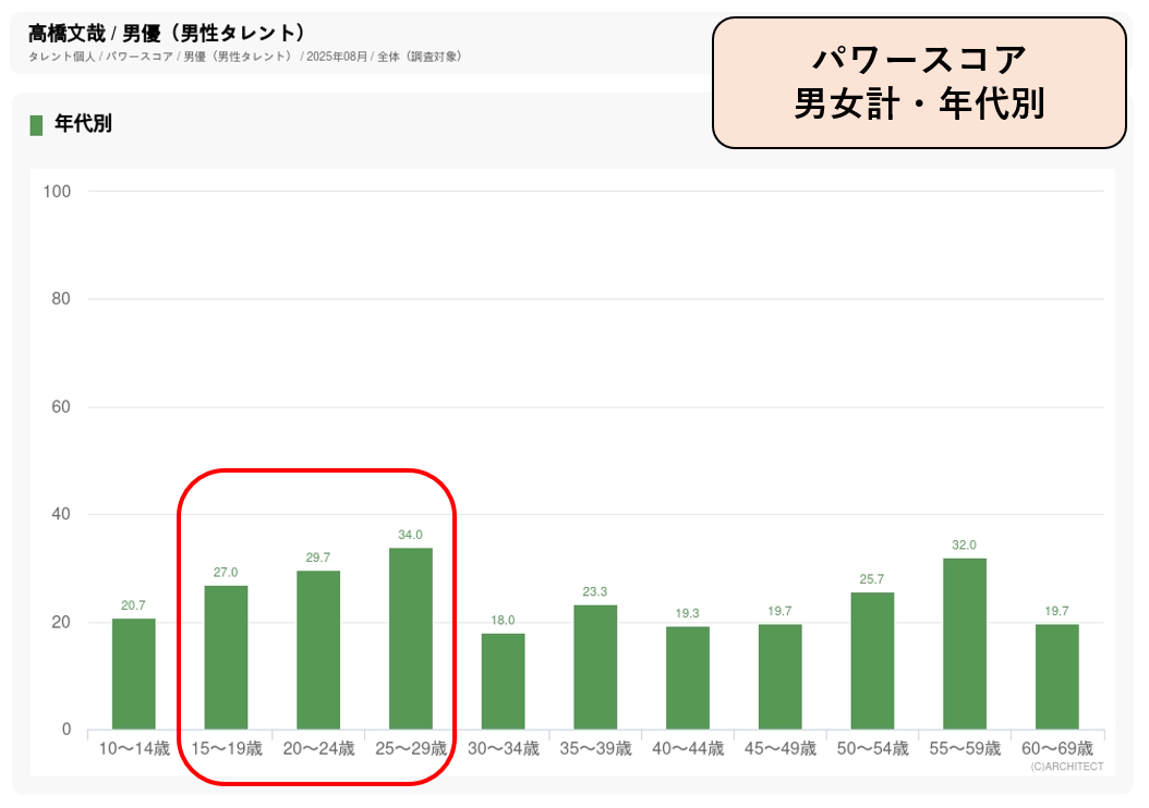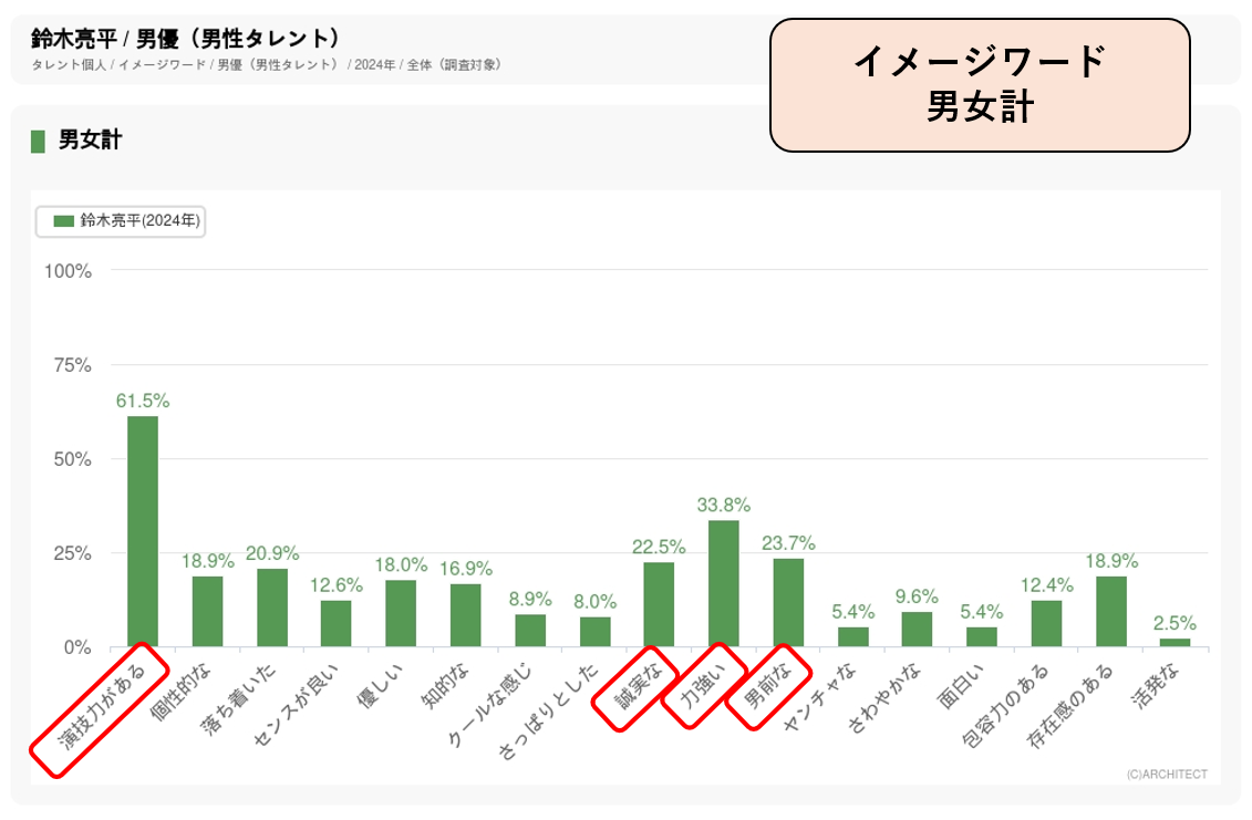 8月度パワースコア・男性俳優部門(バラエティ系の男性タレントは除く)で阿部寛、大泉洋に次ぐ3位。年代別では20代後半女性と50代前半女性のパワースコアが高く、支持層の山が2つある俳優です。1つの年代に支持が偏っていないことが、幅広いターゲットにアピールを目指す人気商品のCMへの起用につながっています。イメージワード調査では「演技力がある」「力強い」「男前な」「誠実な」のスコアが高く、好感度の高さが、ナチュラルなイメージが強いお茶CMに起用された要因になっていると考えられます。