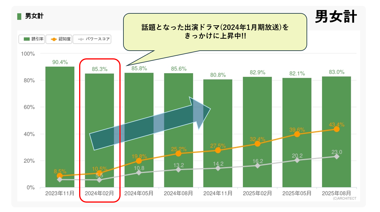 その上昇タイミングを逃さず起用判断につなげた結果、施策後の指標(視聴者反応・好意度・認知改善など)は直近で最も高い水準を記録。