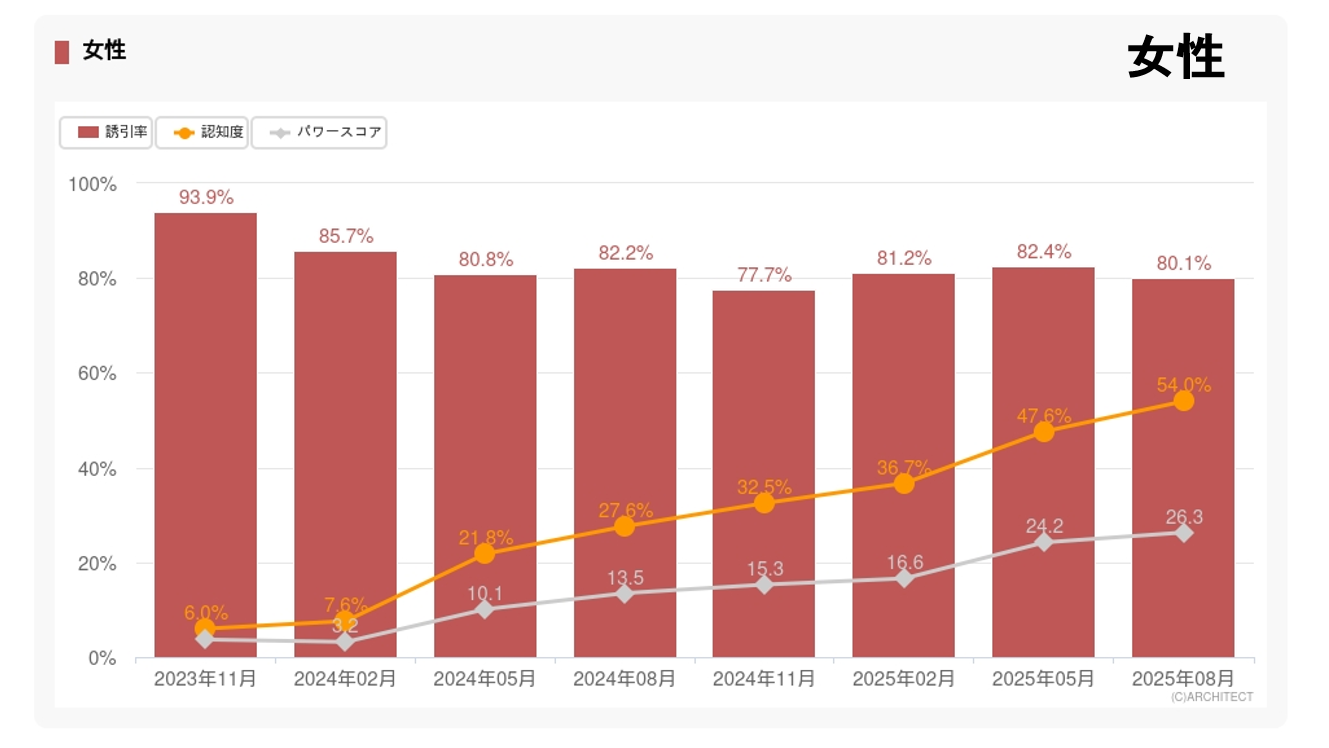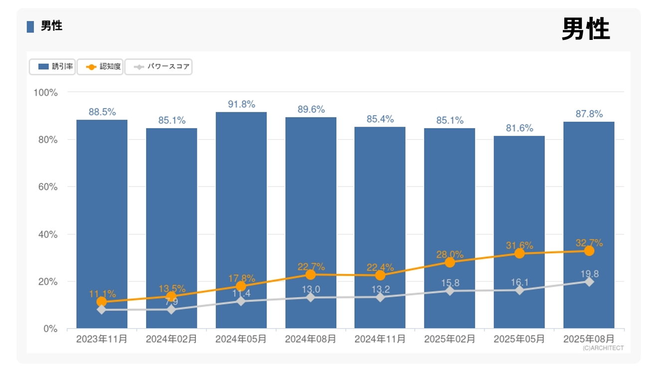 時系列データでは、認知度・誘引率・パワースコアの推移を調査ごとにグラフ化。