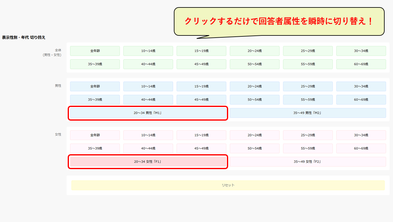 10代~60代を対象に、男女別5歳刻みで調査・集計をしているため、男女だけでなく、年代も5歳刻みで切り替え可能です。