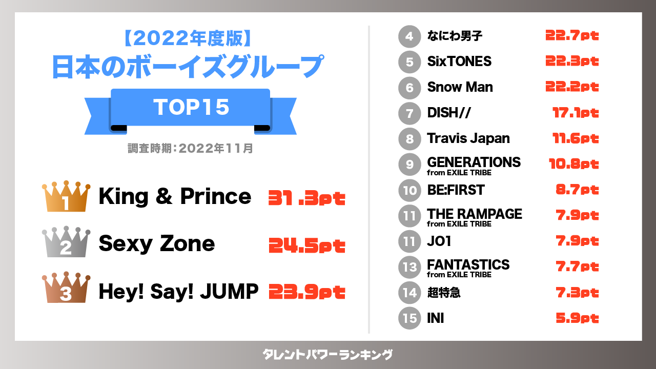 ボーイズグループの人気ランキングは、株式会社アーキテクトが実施する業界最大規模のタレント調査『タレントパワーランキング』をもとにパワースコアを算出しました。こちらのデータから、ランキングを作成しています。