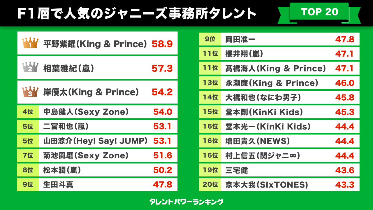 F1層にジャニーズ事務所所属タレントの人気ランキングは、株式会社アーキテクトが実施している業界最大規模のタレント調査『タレントパワーランキング』をもとにパワースコアを算出して作成しました。