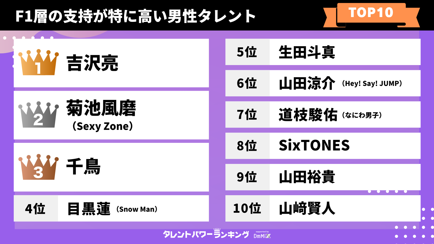昨年は8位だった吉沢亮が今年の1位です。男女全体では49位に対して、F1層では1位で、スコア差17.5ポイントはベスト10に入った中では2番目に大きな数値となっています。