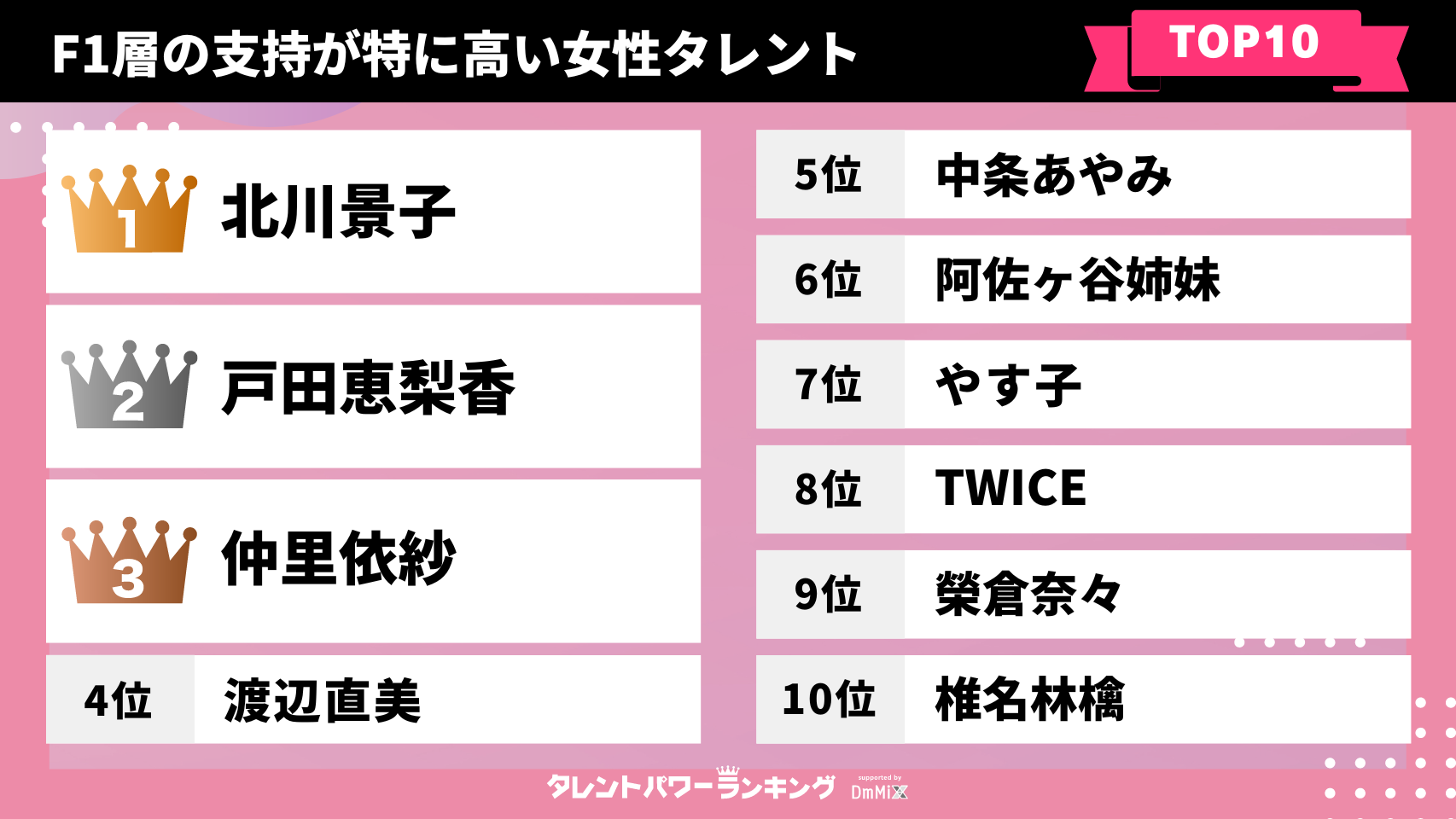 昨年と比較して、女性タレントのベスト10に2年連続でランクインしたのは、北川景子、戸田恵梨香、仲里依紗の3人だけで、残りは顔ぶれが変わっています。1位は、昨年2位だった北川景子です。男女全体では5位、F1層では1位。
