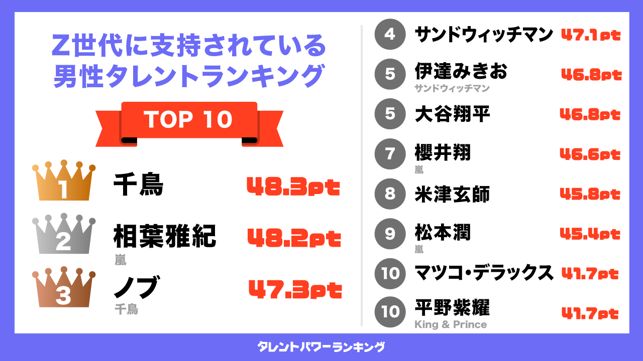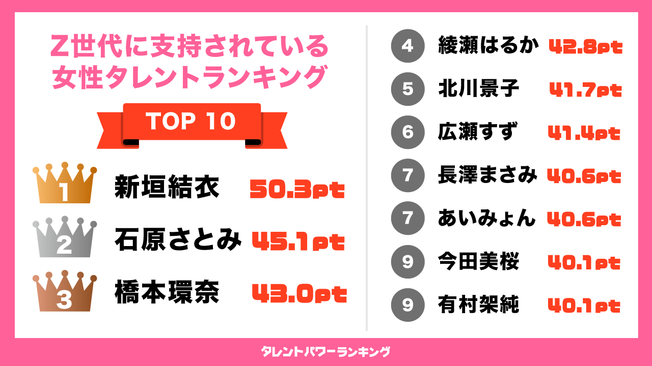 Z世代に支持されているタレントランキングは、株式会社アーキテクトが実施する業界最大規模のタレント調査『タレントパワーランキング』をもとにパワースコアを算出、こちらのデータからランキングが作成されています。