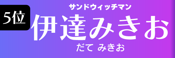 人気お笑いコンビ「サンドウィッチマン」の伊達みきおが個人で5位タイにランクインしました。20代前半男女の回答に限ると1位、男女全体のランキングでは3位です。
