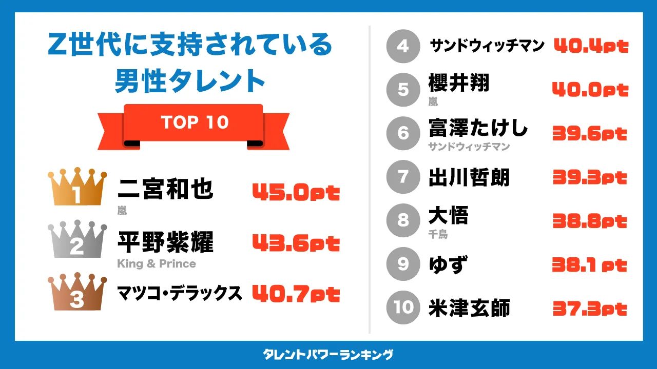 嵐の二宮和也が、前回の2022年11月に続いて2期連続で1位。男女全体では7位で、Z世代での支持の高さが目立っています。Z世代での認知度ランキングでも、全男性タレントの中で1位でした(2位はマツコ・デラックス)。