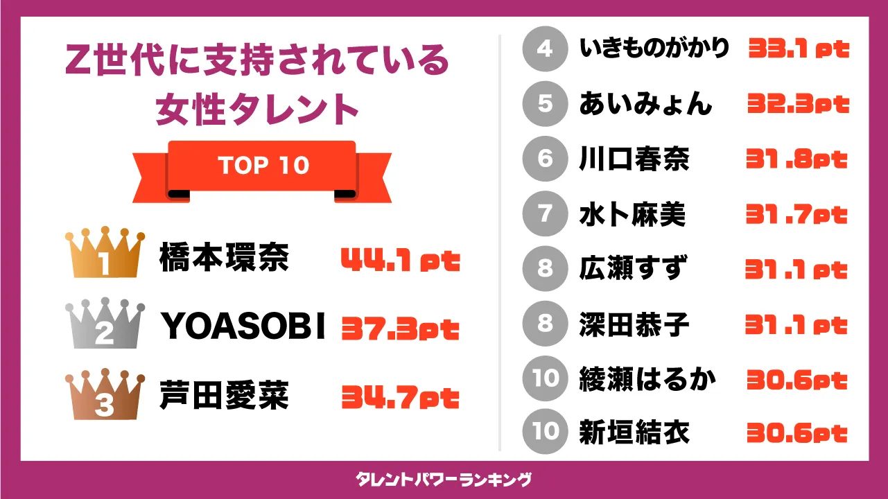そのほか、Z世代で特に高いパワースコアを示している女性タレントとしては、12位・生見愛瑠(男女全体では47位)、14位・TWICE(全体141位)、16位・Ado(全体145位)、19位・指原莉乃(全体40位)、23位・NijiU(全体123位)、25位・ヨルシカ(全体224位)らが挙げられます。