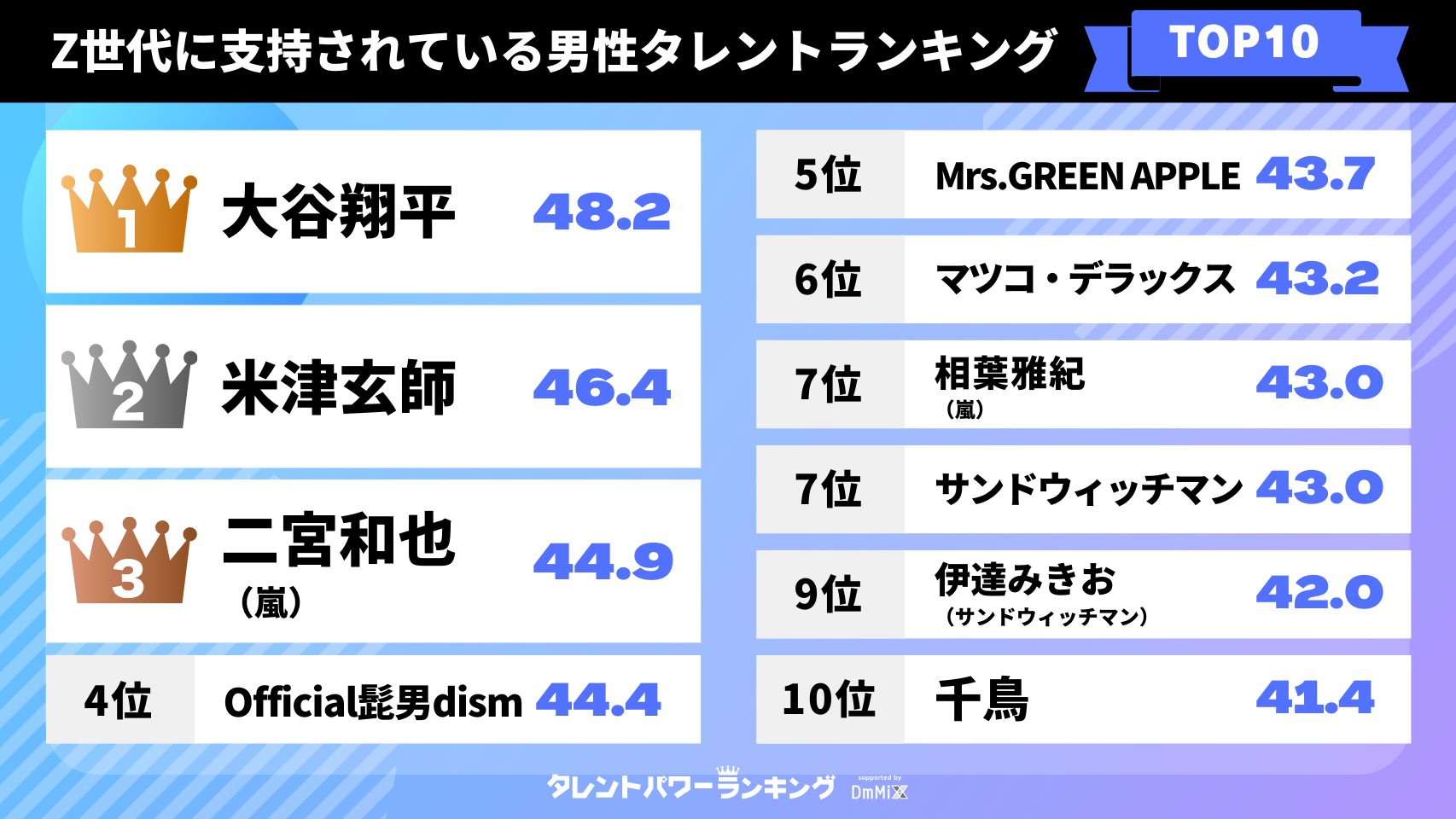 10位は大悟とノブによるお笑いコンビの千鳥です。昨年(2023年2月度調査を使用)のランキングでは大悟が個人で8位にランクインしていましたが、今年はコンビでベスト10に入りました(大悟は17位、ノブは28位)。Z世代の中で20代前半に限定すると2位です。