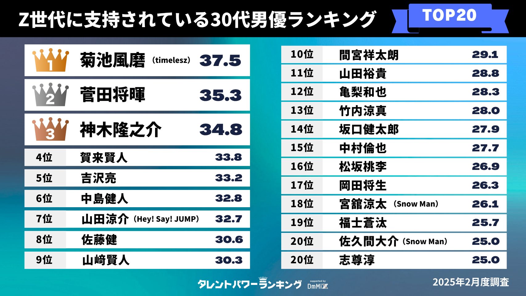株式会社アーキテクトが実施しているタレントパワーランキングの定期調査で、調査対象として登録されている30~39歳の男優・男性タレントの中から10代と20代の男女の回答においてパワースコアが高かった順にランキング化しました。調査対象男優の年齢は2025年6月15日時点です。