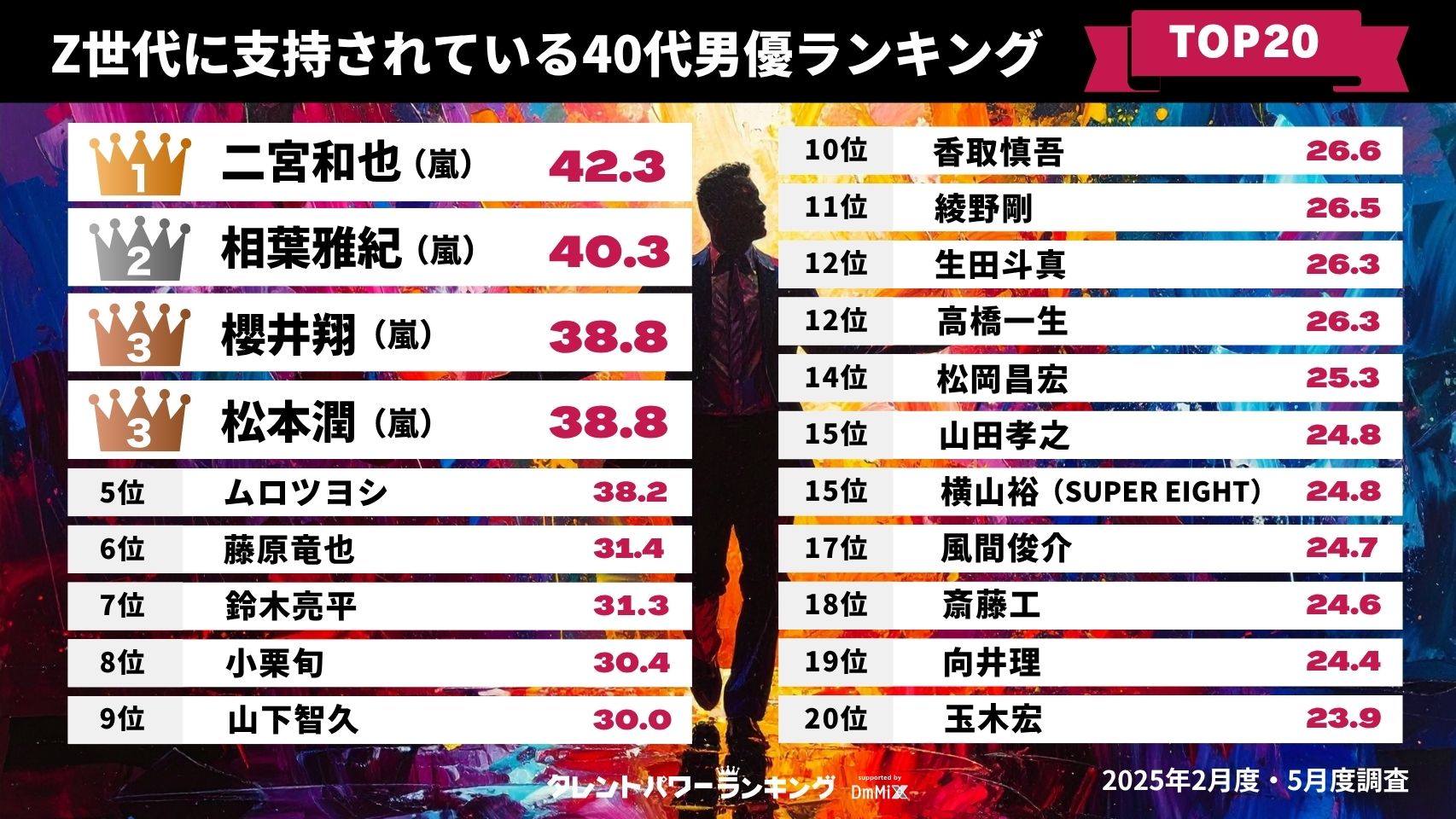 株式会社アーキテクトが実施しているタレントパワーランキングの定期調査で、調査対象として登録されている40~49歳の男優・男性タレントの中から10代と20代の男女の回答においてパワースコアが高かった順にランキング化しました。調査対象男優の年齢は2025年10月1日現在です。
