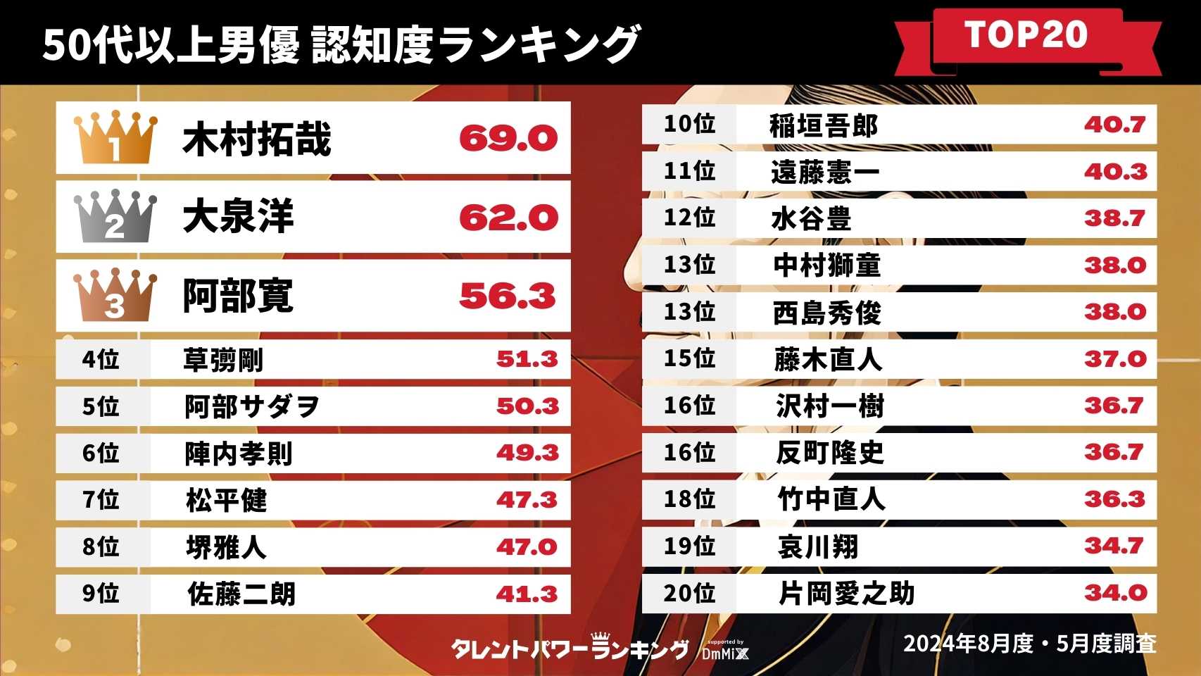 株式会社アーキテクトが実施しているタレントパワーランキングの定期調査で、調査対象として登録されている50歳以上男優の中でZ世代(10代+20~24歳の男女)の回答において認知度(顔と名前を知っている)が高かった順にランキング化しました。タレントパワーランキング調査は2月、5月、8月、11月に実施。今回は、2024年8月度と5月度に調査を行ったデータを使用しています。タレントの年齢は2024年11月1日現在です。