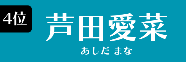 芦田愛菜が昨年と同じく4位。2004年6月23日生まれ、兵庫県出身。『マルモのおきて』(フジ系)など子役時代から活躍して、現在19歳。最近ではテレビ番組のMCやCMでも活躍しています。
