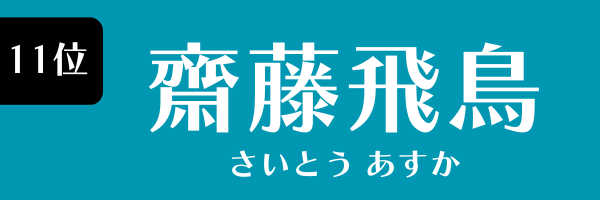 11位は齋藤飛鳥です。1998年8月10日生まれ、東京都出身。乃木坂46の元メンバーで、多くのシングルで表題曲センターをつとめました。