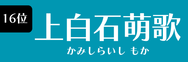 16位は上白石萌歌。2000年2月28日生まれ、鹿児島県出身。小学生のときに「東宝シンデレラ」オーディションでグランプリに選ばれて、芸能界入り。2021年のNHK朝ドラ『ちむどんどん』ではヒロインの妹役を演じました。