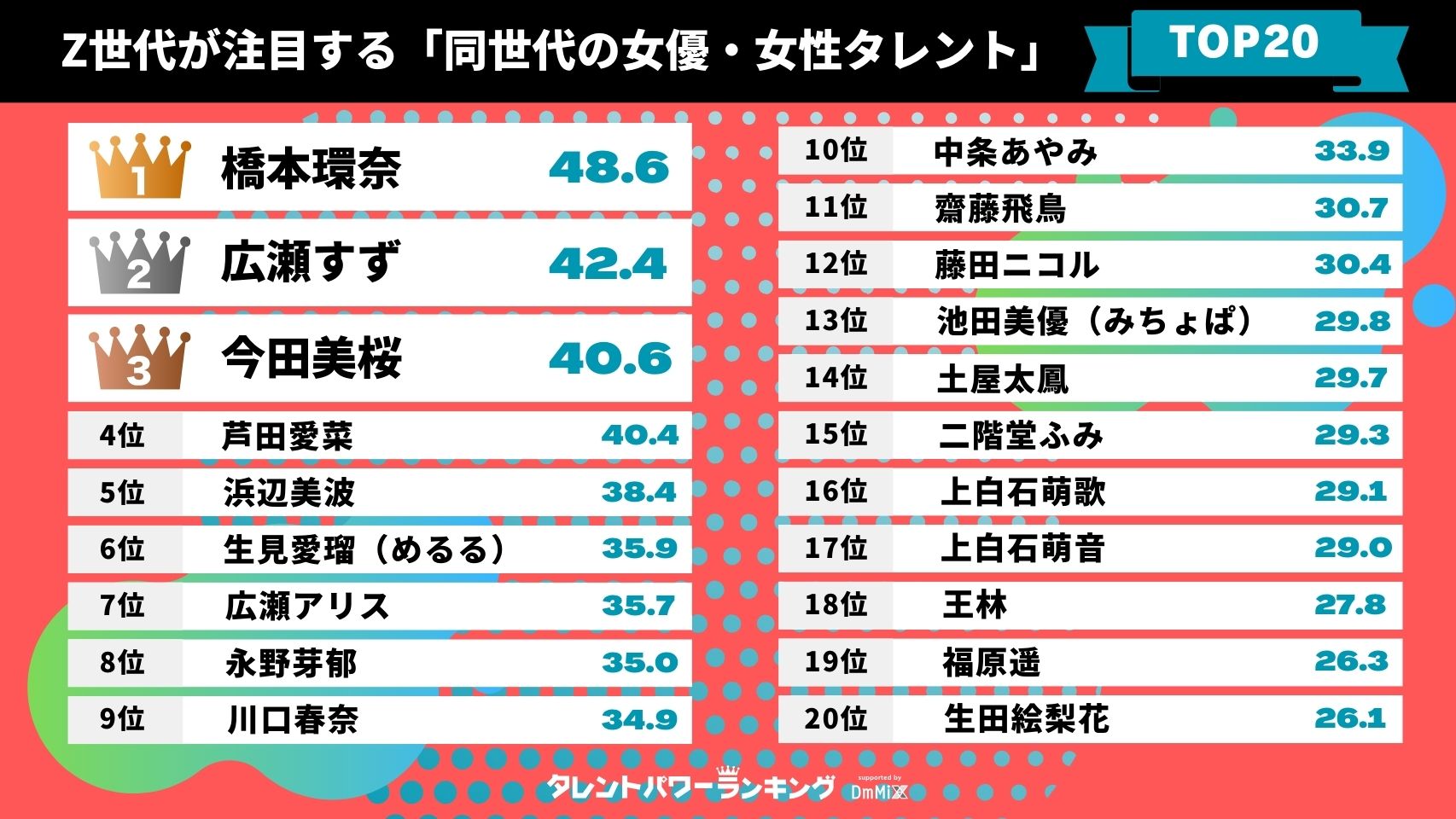 株式会社アーキテクトが実施しているタレントパワーランキングの定期調査で、10代と20代の女優・女性タレントの中からZ世代(10代前半・後半、20代前半)の男女の回答においてパワースコアが高かった順にランキング化しました。調査対象タレントの年齢は2024年5月15日現在で、年齢非公表のタレントは除外しています。なお、文中に出てくる「全体順位」は男女全年齢(10~60代)における10代と20代の女優・女性タレントの中での順位です。