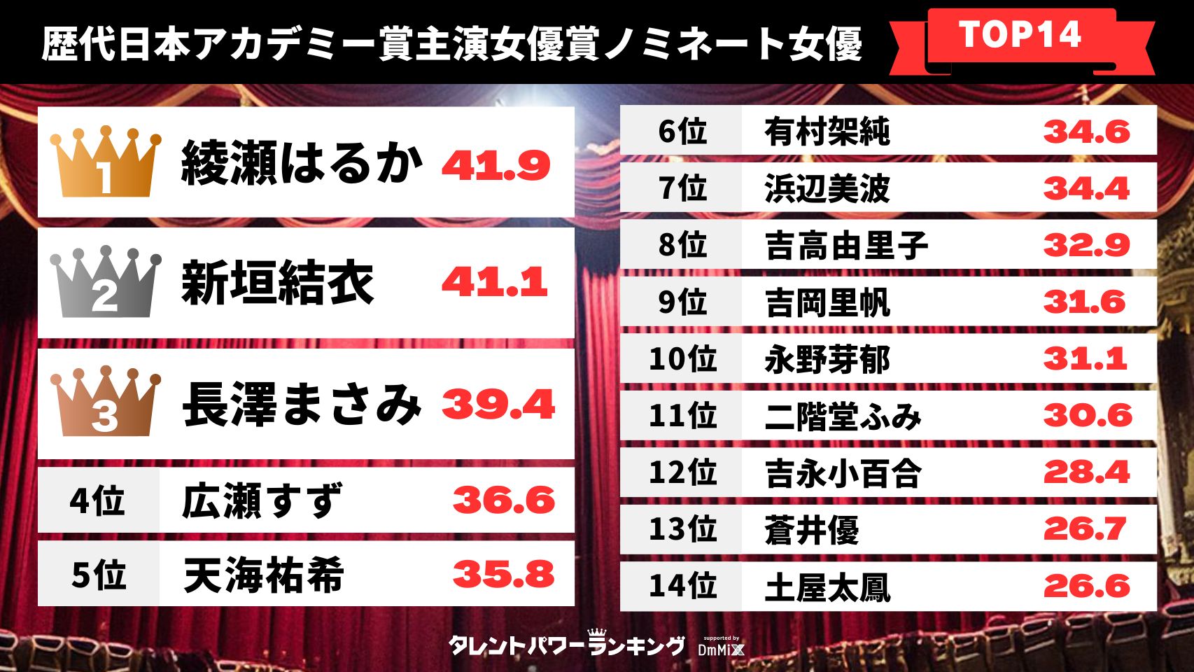 今回発表する日本アカデミー賞主演女優賞ノミネートの女優ランキングは、株式会社アーキテクトが行う、業界最大規模のタレント調査『タレントパワーランキング』から、パワースコアを算出したものです。