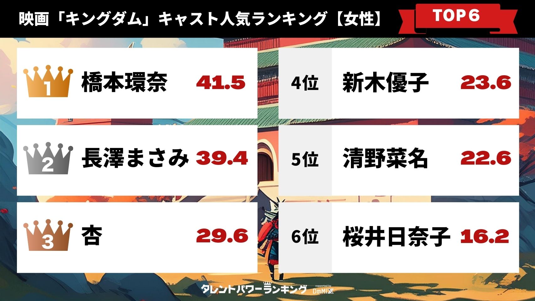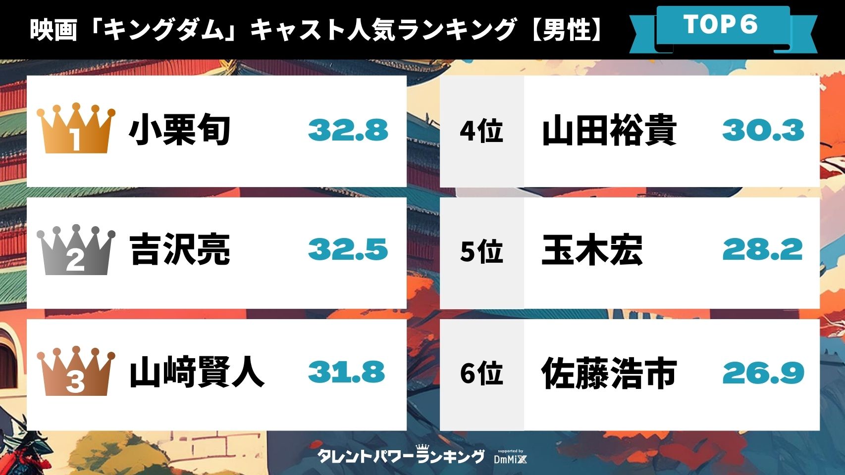 映画『キングダム』シリーズに出演するキャストの人気ランキングは、株式会社アーキテクトが実施する業界最大規模のタレント調査『タレントパワーランキング』をもとにパワースコアを算出しました。