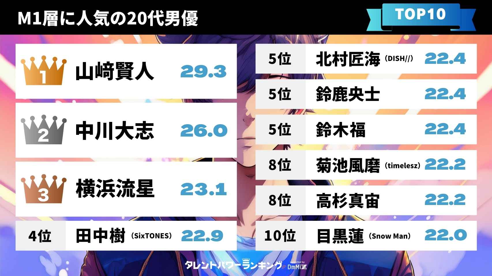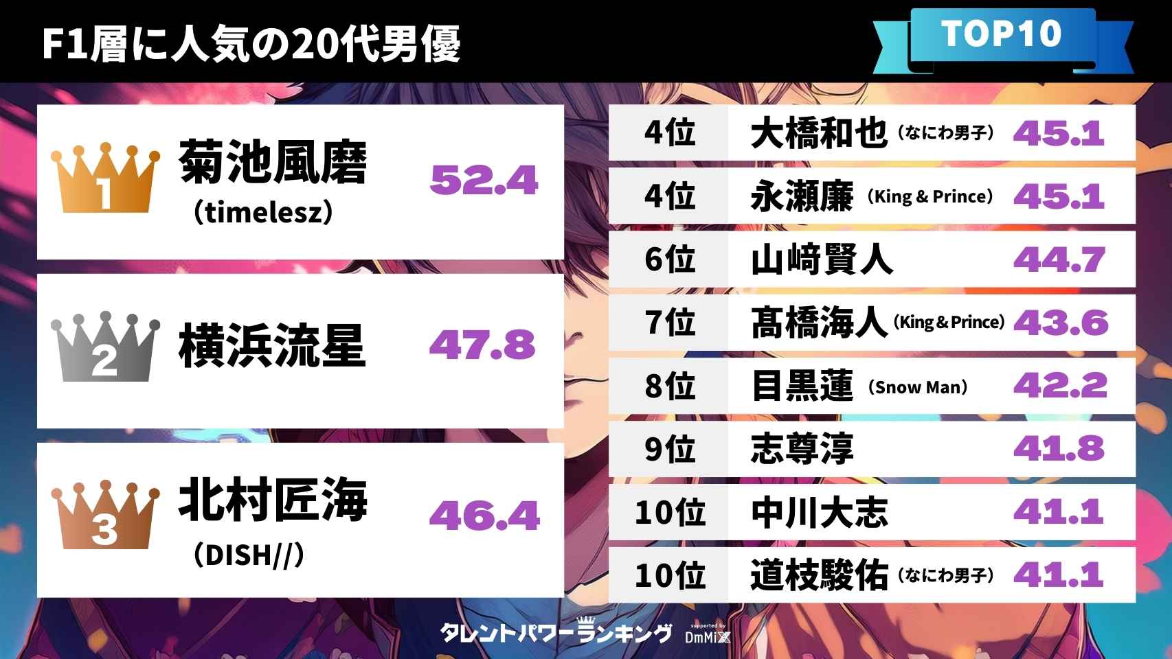 株式会社アーキテクトが実施しているタレントパワーランキングの定期調査で、調査対象として登録されている20~29歳男優の中でM1層(20~34歳男性)とF1層(20~34歳女性)の回答においてパワースコアが高かった順に、それぞれランキング化しました。タレントの年齢、所属グループは2024年8月26日時点です。