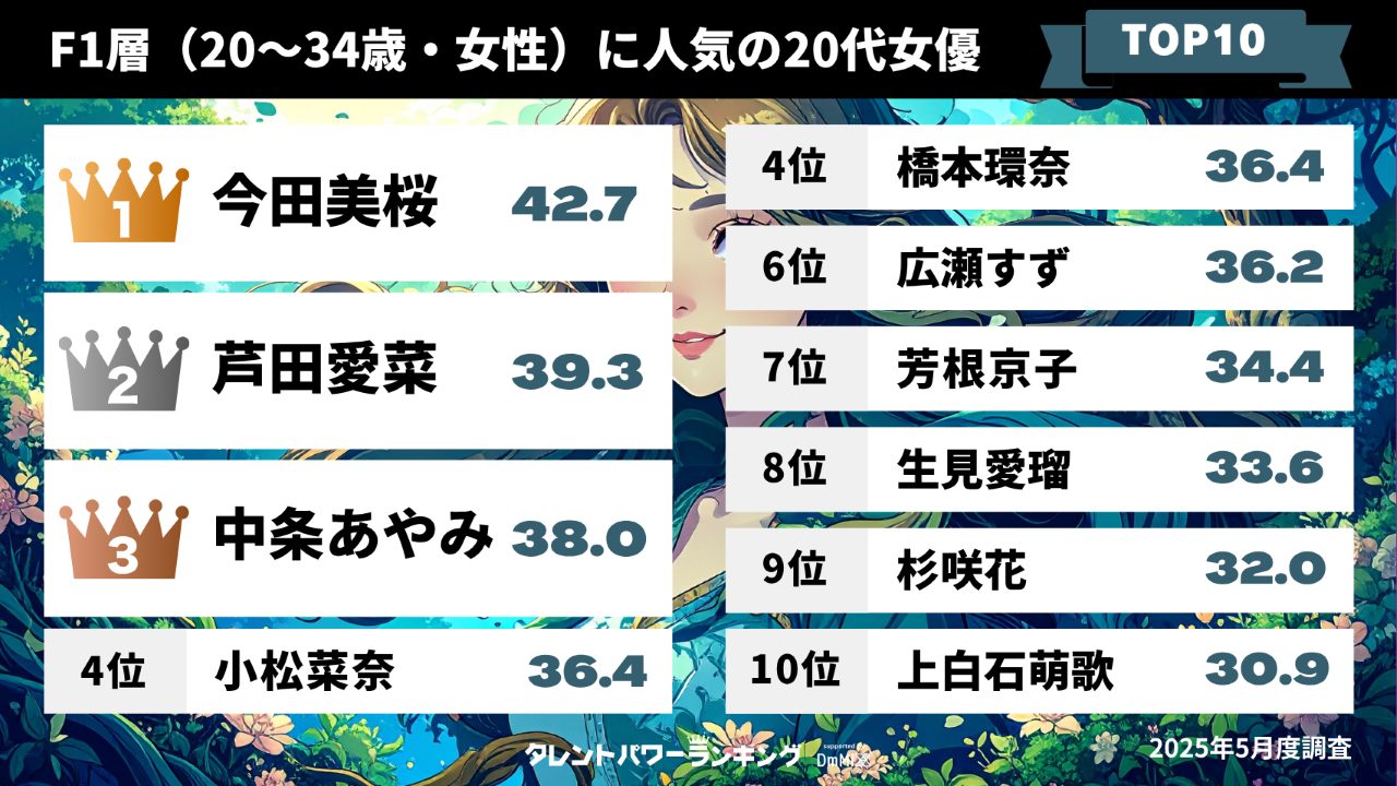 F1層の1位は今田美桜です。昨年の2位から順位を1つ上げました。M1層では10位で、女性支持が高くなっています。2025年6月30日から放送が開始されたキリンビール「晴れ風」の新CM“祭りとビール”にも出演中です。『あんぱん』以降の活動予定としては、9月から開催される「東京2025世界陸上」のTBS系による中継のアンバサダーを務めます。