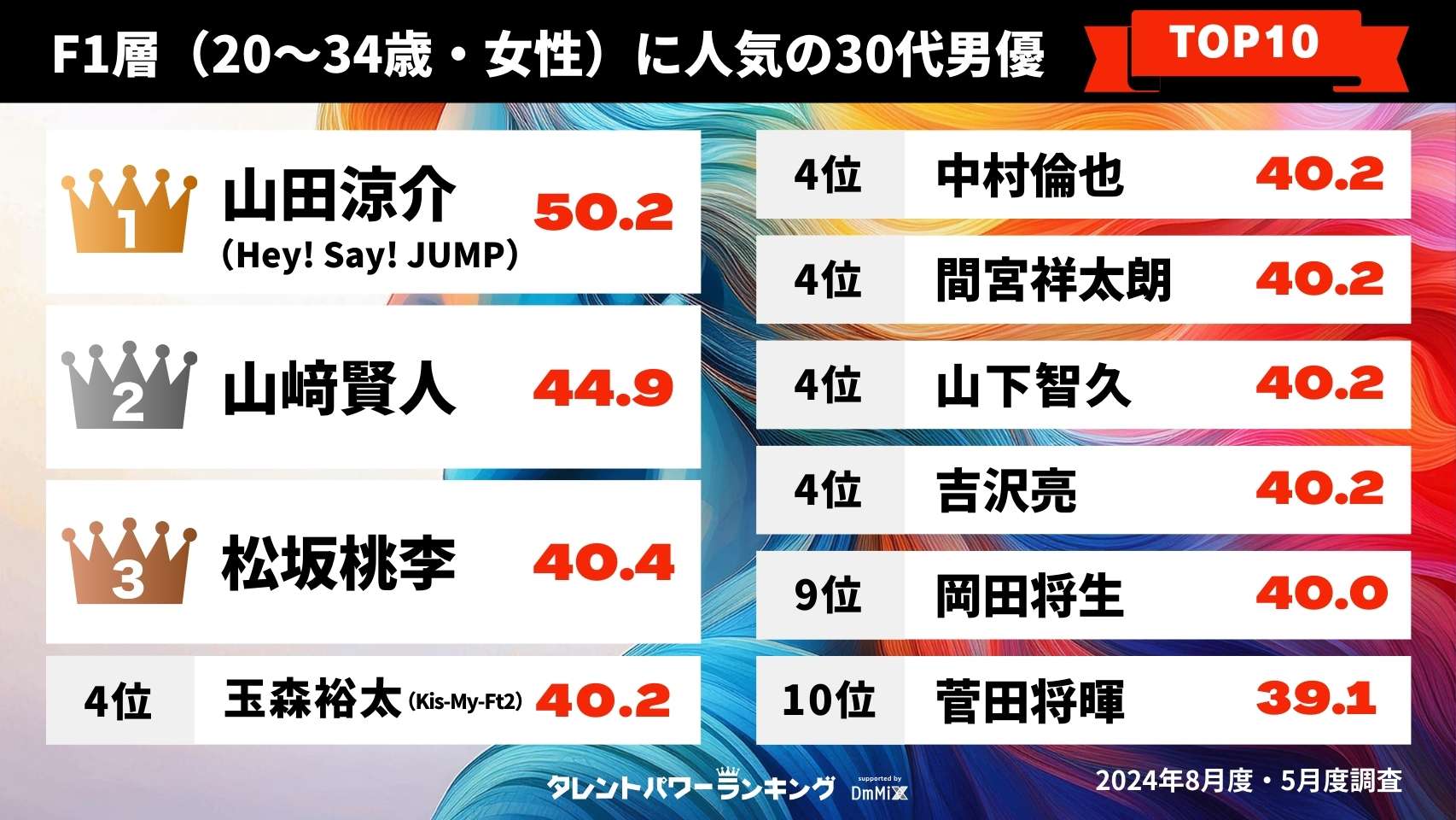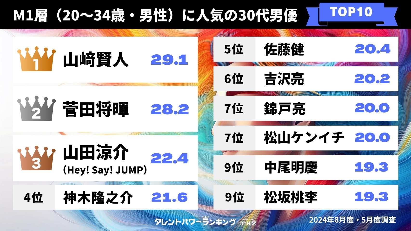 1位は山田涼介です。M1層では3位で、男女ともにトップ3入りしています。