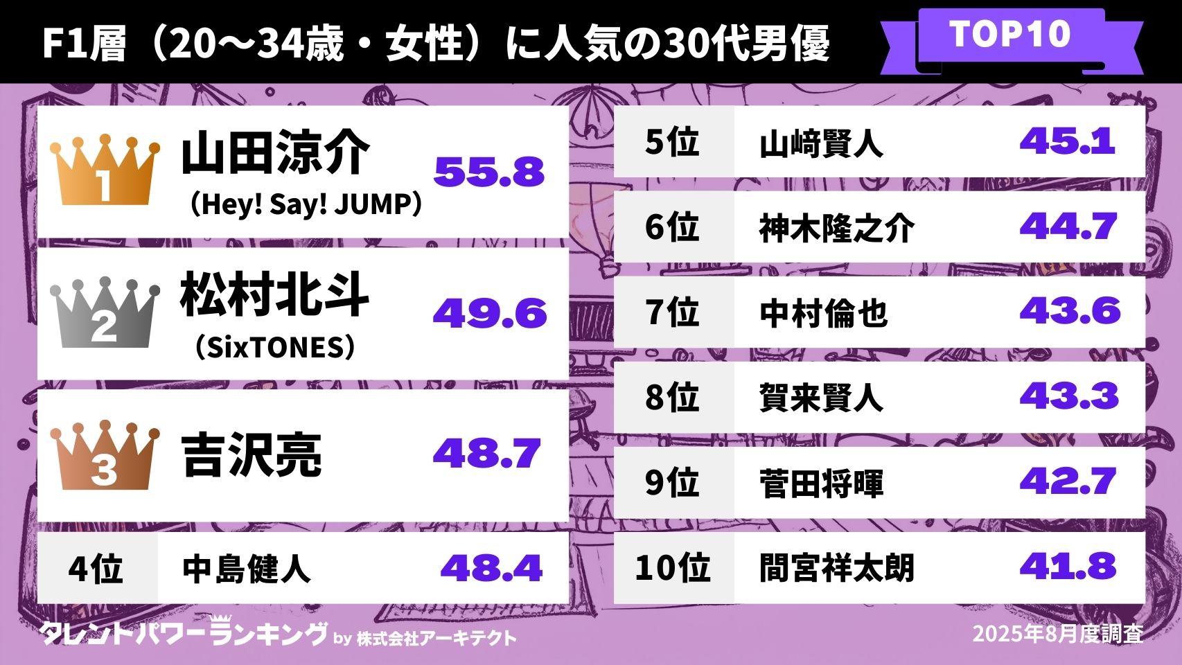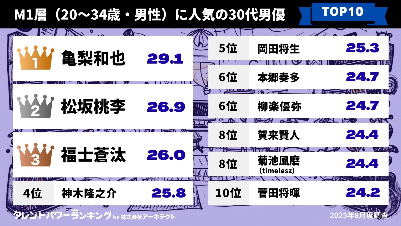 株式会社アーキテクトが実施しているタレントパワーランキングの定期調査で、調査対象として登録されている30~39歳男優の中でM1層(20~34歳男性)とF1層(20~34歳女性)のそれぞれの回答においてパワースコアが高かった順にランキング化しました。タレントの年齢は2025年12月15日時点です。
