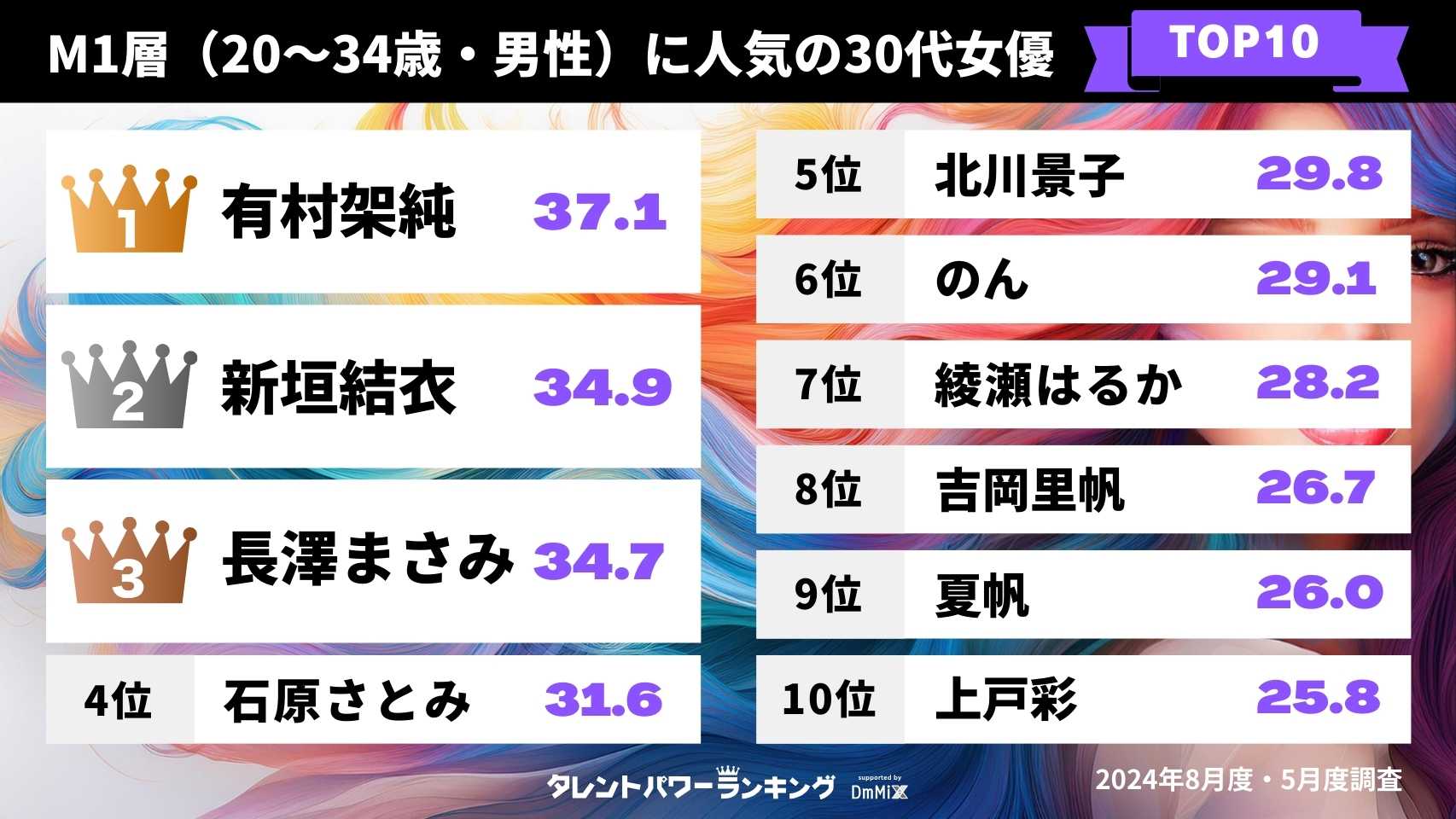 株式会社アーキテクトが実施しているタレントパワーランキングの定期調査で、調査対象として登録されている30~39歳女優の中でM1層(20~34歳男性)とF1層(20~34歳女性)のそれぞれの回答においてパワースコアが高かった順にランキング化しました。タレントの年齢は2024年11月1日時点です。