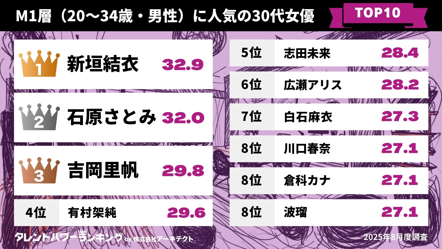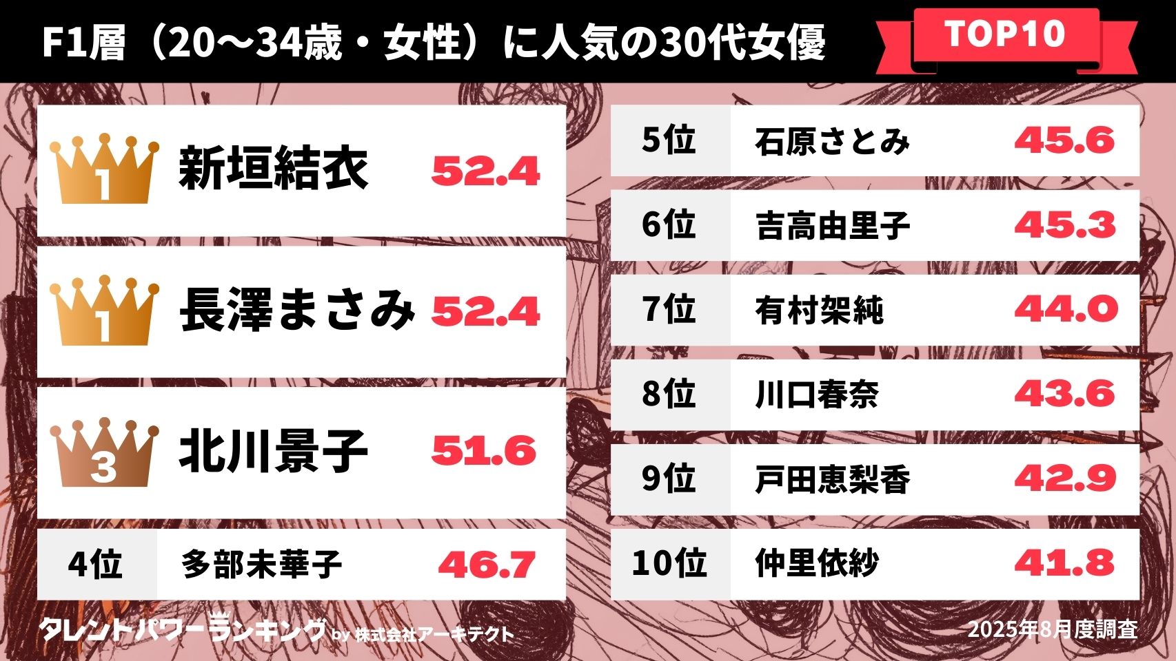 株式会社アーキテクトが実施しているタレントパワーランキングの定期調査で、調査対象として登録されている30~39歳女優の中でM1層(20~34歳男性)とF1層(20~34歳女性)のそれぞれの回答においてパワースコアが高かった順にランキング化しました。タレントの年齢は2025年12月15日時点です。