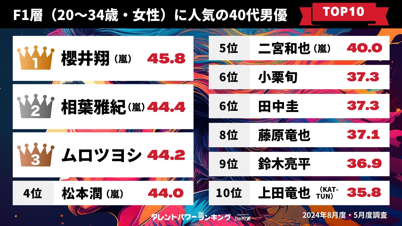 F1層の1位は、M1層では9位の嵐・櫻井翔です。前回の12位から順位を上げて、F1層での上昇率でも40代男優1位でした。ウェルネスブランド・TENTIALのイメージキャラクターに起用されて、2024年11月18日に放映がスタートした疲労回復パジャマ「BAKUNE」“パジャマとBAKUNE”篇のCMに出演中。