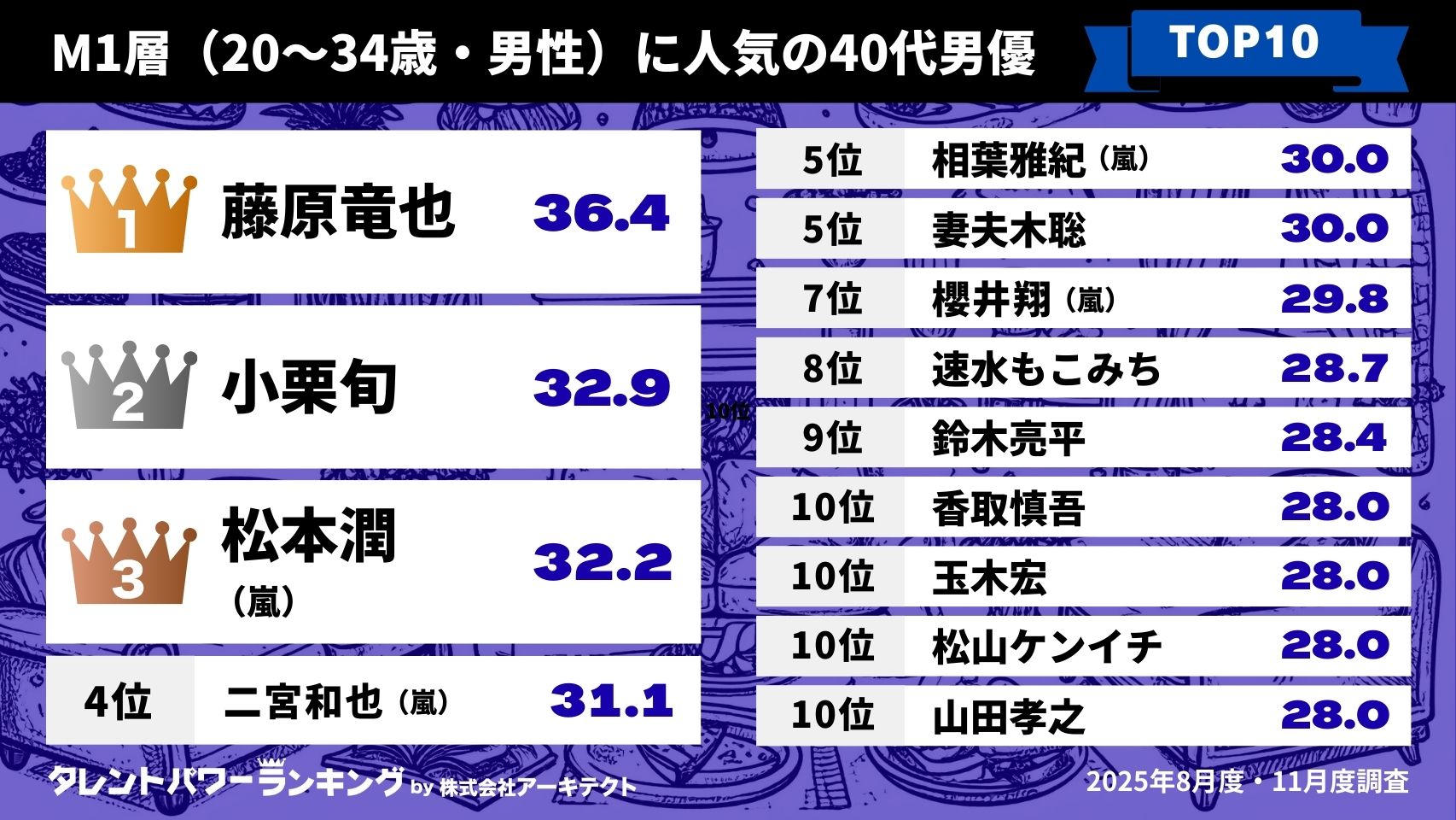 嵐の相葉雅紀が3位にランクイン。M1層では5位で、男女両方で高く支持されています。2025年9月から放送されているマイナビのCMでは有村架純と共演しています。