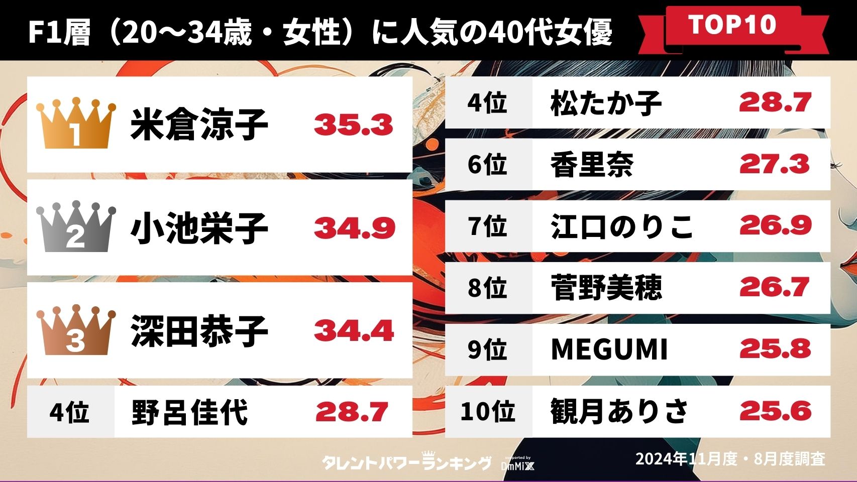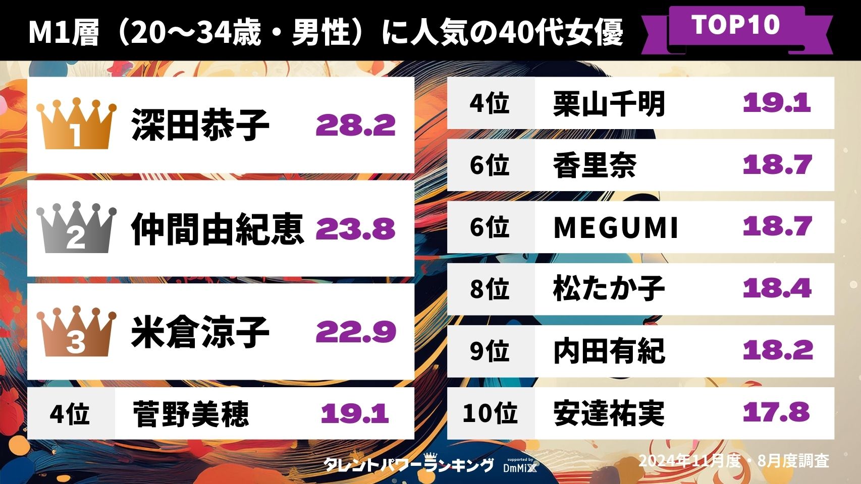 株式会社アーキテクトが実施しているタレントパワーランキングの定期調査で、調査対象として登録されている40~49歳女優の中でM1層(20~34歳男性)とF1層(20~34歳女性)のそれぞれの回答においてパワースコアが高かった順にランキング化しました。年齢は2025年1月15日時点です。年齢非公表の女優はランキングから除外しています。