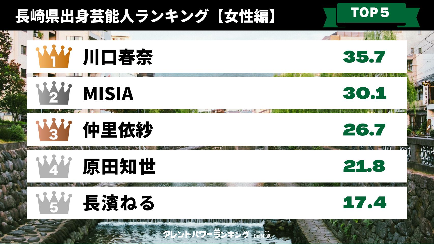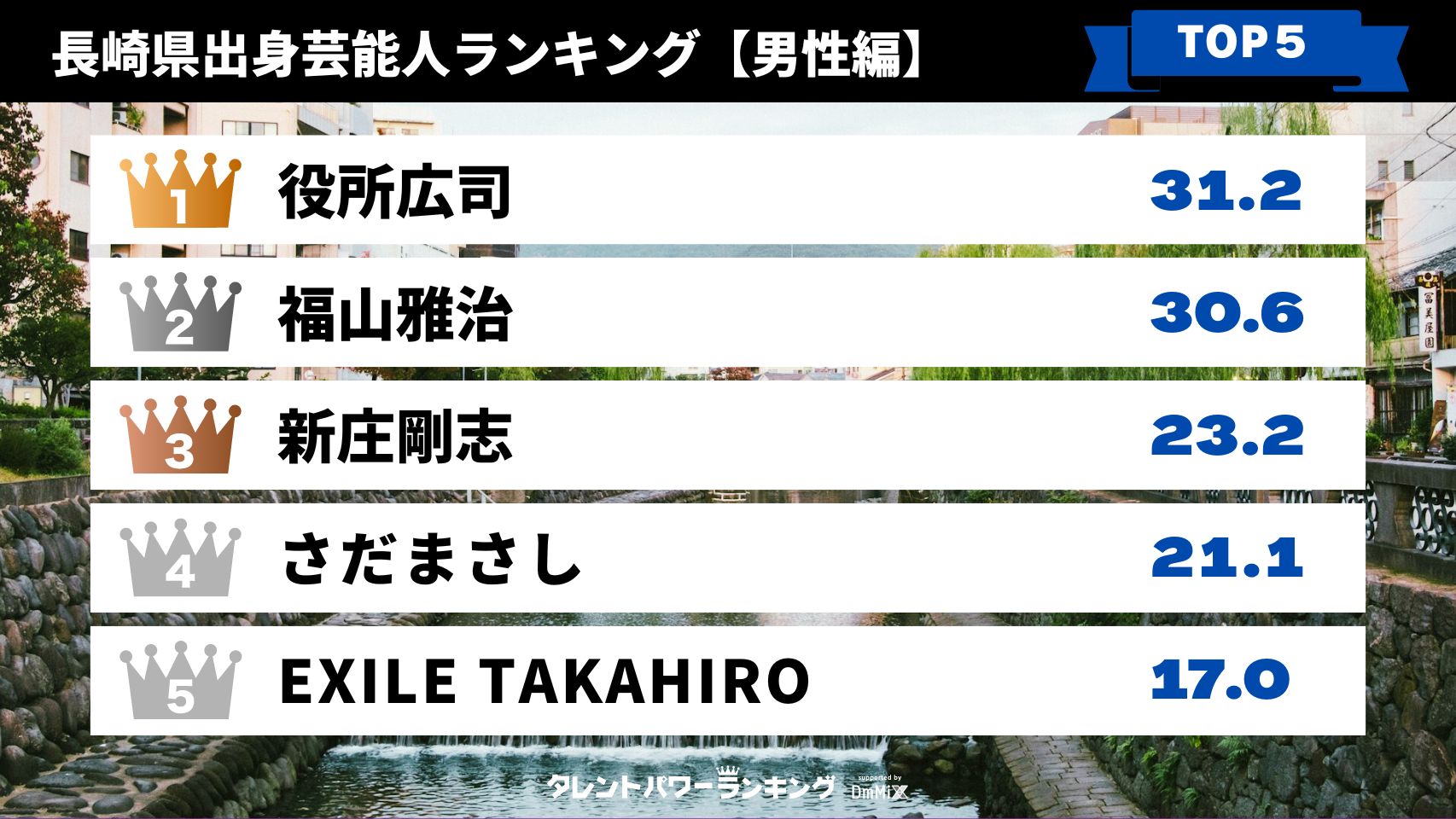 株式会社アーキテクトが実施している、業界最大規模のタレント調査『タレントパワーランキング』をもとに算出したパワースコアをもとに作成したのが、長崎出身芸能人の人気ランキングです。