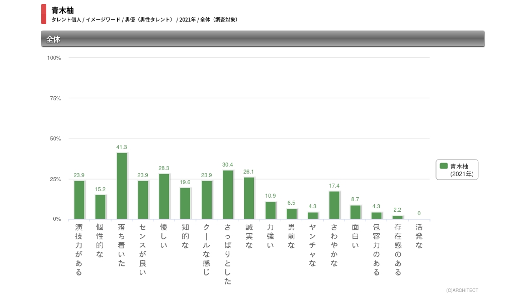 【青木柚】イメージワード2021年青木は、どのようなイメージを持たれているのか。イメージワード調査の結果を見ると、「落ち着いた」が41.3%でダントツの1位。2位は30.4%で「さっぱりとした」、3位は28.3%で「優しい」となっている。以下、「誠実な」「演技力がある」「センスが良い」「クールな感じ」と続く。「落ち着いた」「クールな感じ」などは “陰”のイメージを想起させるが、今後、『最初はパー』のような“陽”のキャラクターが増えることで変化しそうだ。