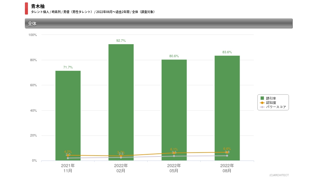 【青木柚】時系列:2022年8月~過去2年間青木のタレントパワーの推移を見ると、2021年11月に4.2%だった認知度が、2022年8月に6.6%に急伸している。「見たい、知りたい」の指標である誘引率は、2022年2月に最高の92.7%をマーク。これは2021年の出演ラッシュと『カムカムエヴリバディ』への出演発表効果が大きそうだ。認知度に誘引率を掛け合わせたパワースコアは、2021年11月の2.0から右肩上がりで上昇し、2022年8月には最高の3.8を記録。今年の活躍が、スコアを押し上げていることが分かる。