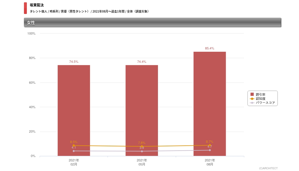 男女別で比較すると(上グラフ)、男性の認知度、パワースコアはほぼ横ばいだが、女性は上昇している。例えば2021年2月に74.5%だった誘引率は、8月に85.4%に急上昇。パワースコアは4.1から4.7へ上がっている。その間に放送された『にぶんのいち夫婦』などが影響していそうだ。