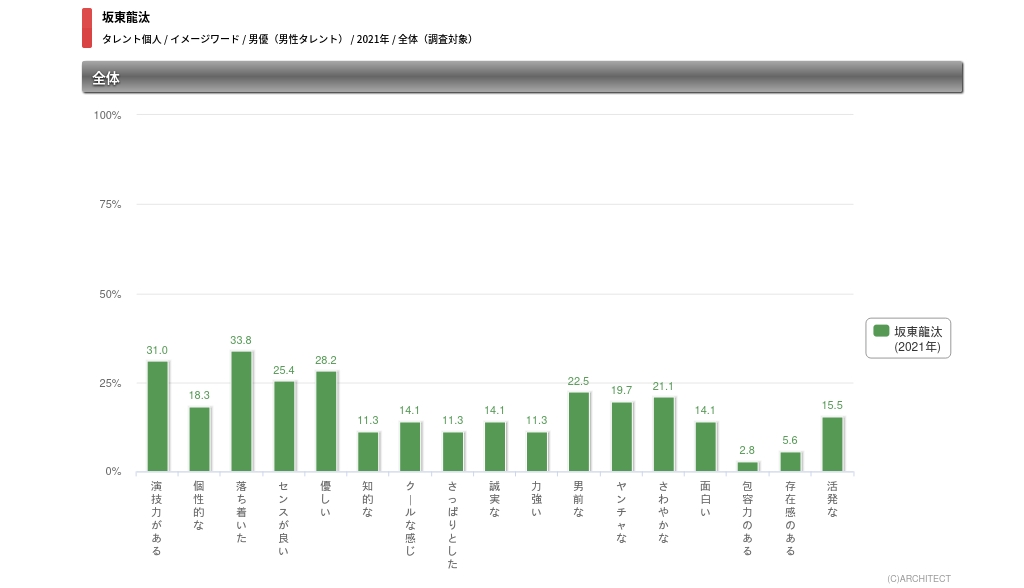 イメージワード調査の結果は、1位は「落ち着いた」で33.8%、2位は「演技力がある」で31.0%、3位が「優しい」で28.2%となっている。以降、「センスが良い」「男前な」「さわやかな」「ヤンチャな」「個性的な」「活発な」「クールな感じ」と続く。突出したワードがなく、幅広いイメージを獲得していることが特徴だ。ツイッターを見ても、「振り幅えぐすぎて怖い」「ホントにカメレオン俳優」といった視聴者のコメントが多く、作品や役にフィットするタイプの俳優であることが分かる。