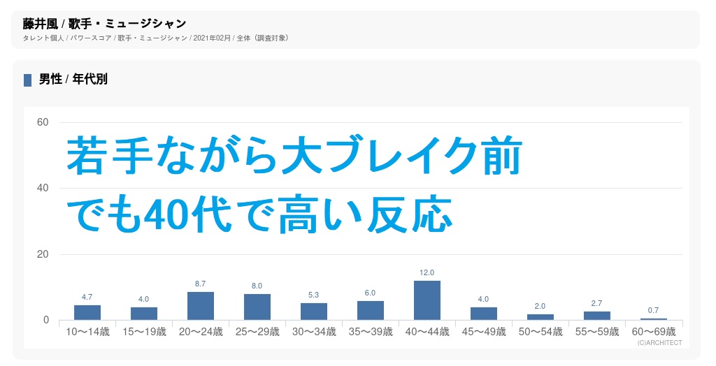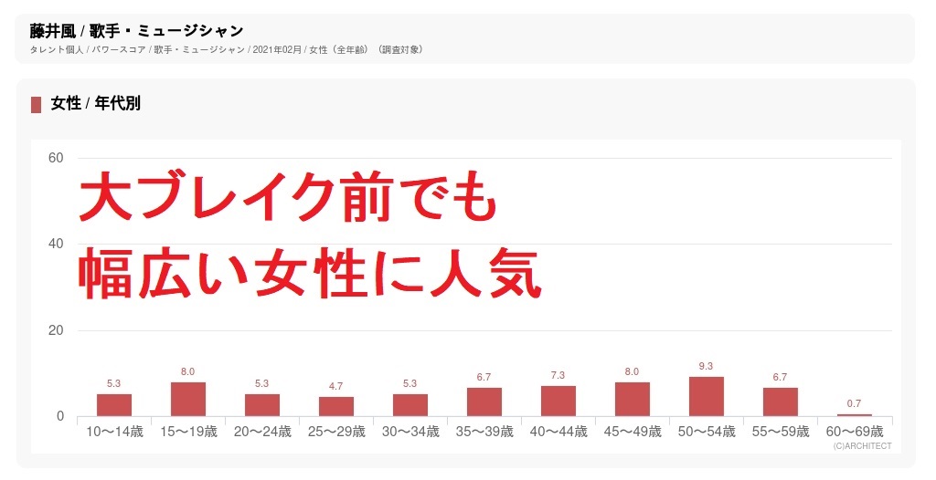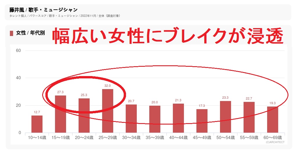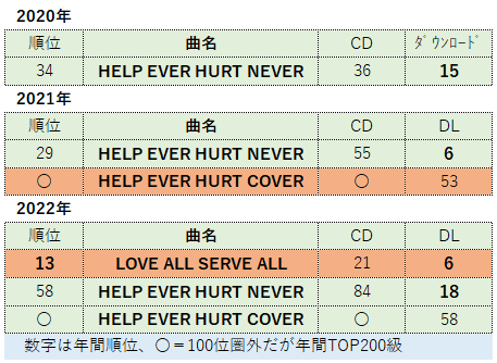 この影響で、2022年初、ソングチャート、アルバムチャートともに旧作がこぞって上昇し、タレントパワーでも幅広い層でポイントが伸びた。特に、女性ではティーン~20代でトップスター級のスコアとなりつつ、50代、60代でもヒット常連級のスコアとなっており、これは20代アーティストとしては非常に珍しい現象。大人の女性を酔わせる魅力がある証拠と言える。3月にリリースした2ndアルバム『LOVE ALL SERVE ALL』は初登場1位、CDは累計23万枚だが、ダウンロードやストリーミングのポイントを換算して50万枚相当のポイントとなっている。