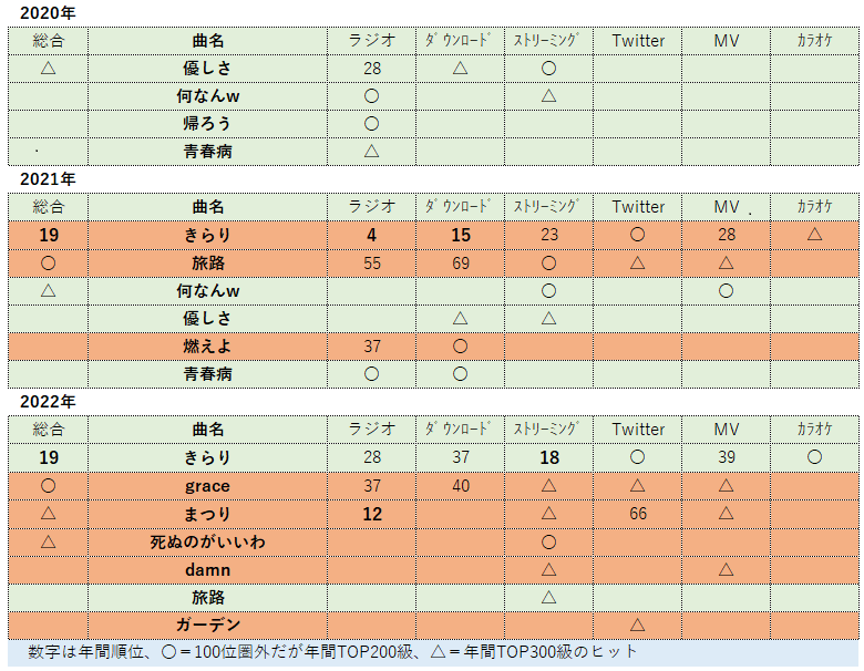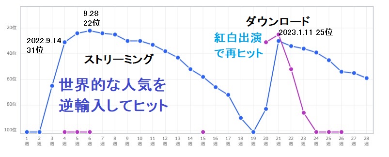 また、同年8月頃から1stアルバムに収録された「死ぬのがいいわ」が東南アジアを中心に動画投稿が爆発的にヒットし、それを逆輸入する形で日本でもストリーミングで上昇。本作は、同年末のNHK紅白歌合戦でも披露され、ここでソングチャートのダウンロードでもTOP30入りし、さらにファン層が広がったことが推測される。