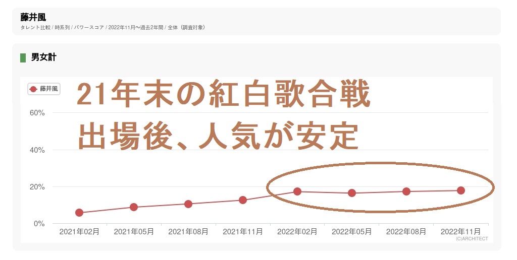 (過去2年間のタレントパワースコアの推移、紅白歌合戦初出場後、明らかに伸びている)