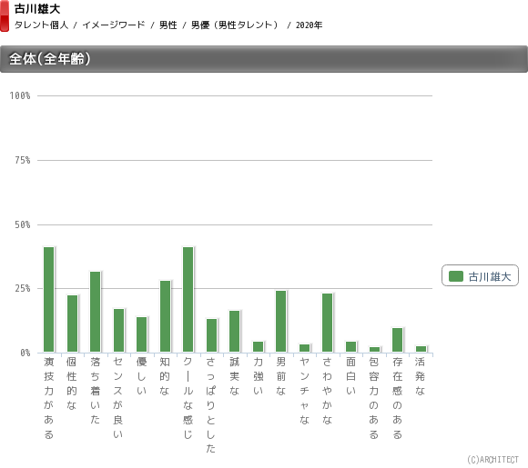イメージワード調査では、「演技力がある」と「クールな感じ」が1位で41%。以降、「落ち着いた」が31.7%、「知的な」が28.2%、「男前な」が24.2%、「さわやかな」が23.3%となっている。「クール」「落ち着いた」「知的」といったイメージが、御曹司や貴公子が似合う要因になっているのだろう。